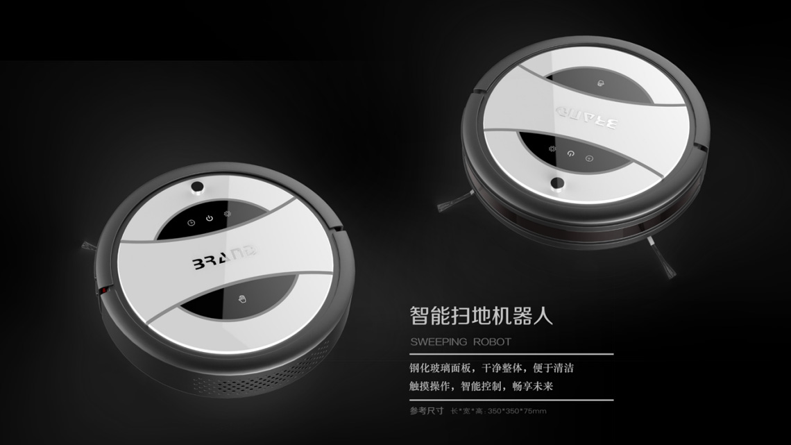 创作说明:智能扫地机器人设计采用钢化玻璃面板,干净整体,便于清洁,触摸操作,智能控制,畅想未来;上壳面板按压整体弹起,可取出尘盒,并且可以从内部加水口给水箱加水;超薄静音设计,带给你舒适体验。
