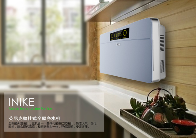 创作说明:净水器全新的外观设计,打破全屋净水器设备感太强的造型,让产品有个崭新的视觉冲击,更好的融入现代家居生活。产品采用平板式铝质面板,让产品富有科技感和价值感。设计中考虑了使用尺寸问题,让产品更薄更小,以崭新的壁挂式解决空间小问题,同时能起到家居装饰作用。智能的显示面板使用英尼克logo图标来表现滤芯寿命和显示流量等,让使用更直观,更人性化。