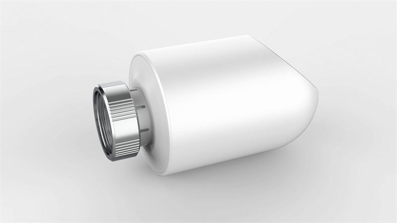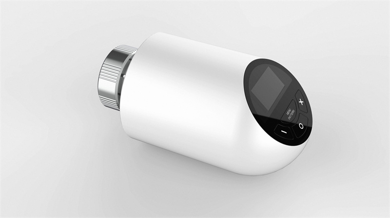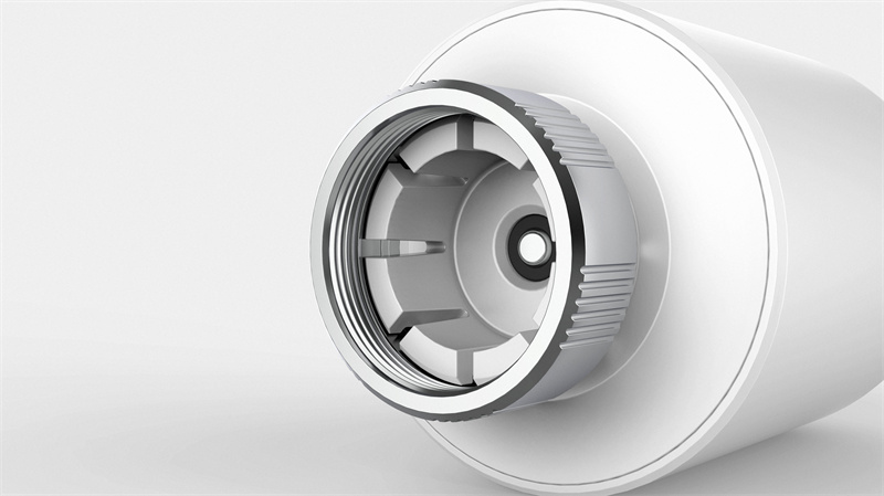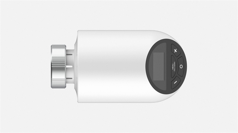 金属旋钮的内齿纹设计使其能与暖气阀门紧密连接,接口简洁。显示屏在熄灭状态下与白色面板融为一体,保持外观的整体性。