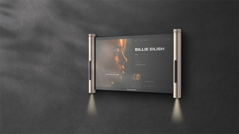 这一设计淡化了科技产品的机械感,赋予墙面悬挂的艺术气质。整体比例经过精心推敲,既确保显示区域的舒适视野,又使“轴杆”成为点睛装饰。
