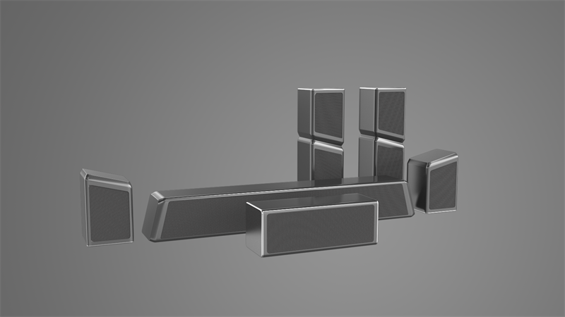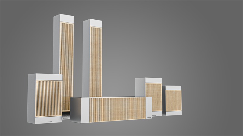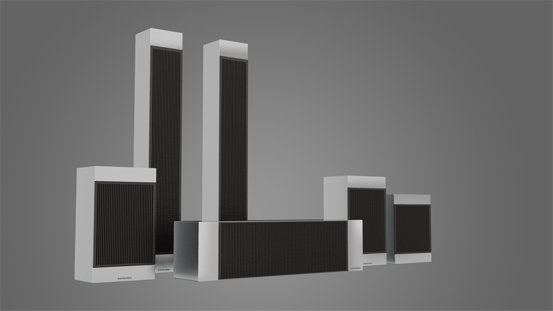 高挑的主音箱与紧凑的环绕单元形成错落有致的韵律感,既满足专业声场构建,又成为空间中的视觉焦点。
